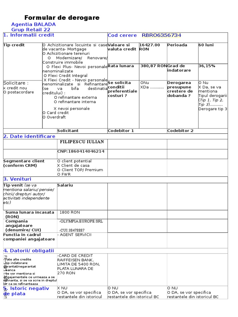 Alte informatii rambursare rata. Dobanda 2 35 robor la 3 luni pentru restul perioadei. Beneficiezi de 0 comisioane de acordare si administrare iar dobanda se aplica doar pentru sumele utilizate. Exemplu de calcul pentru un bun cu pret de achizitie de 94 000 lei fara tva avans 10 perioada de finantare 5 ani cu o rata a dobanzii fixe de 7 45 pentru finantare in lei comision de analiza dosar 790 lei servicii de inmatriculare 675 lei taxa arhiva electronica 130 lei si valoare.